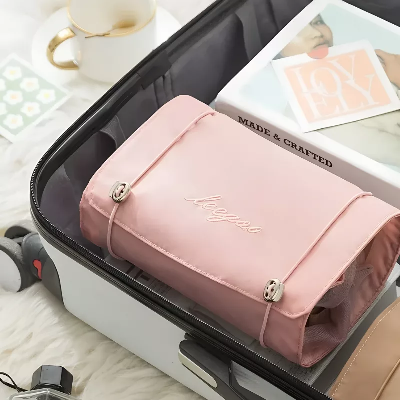 Denna vikbara sminkväska kan fästas på dörrar, handduksstänger eller krokar. Detta gör innehållet lätt att se och ta tag i och hjälper till att spara plats på bänken.