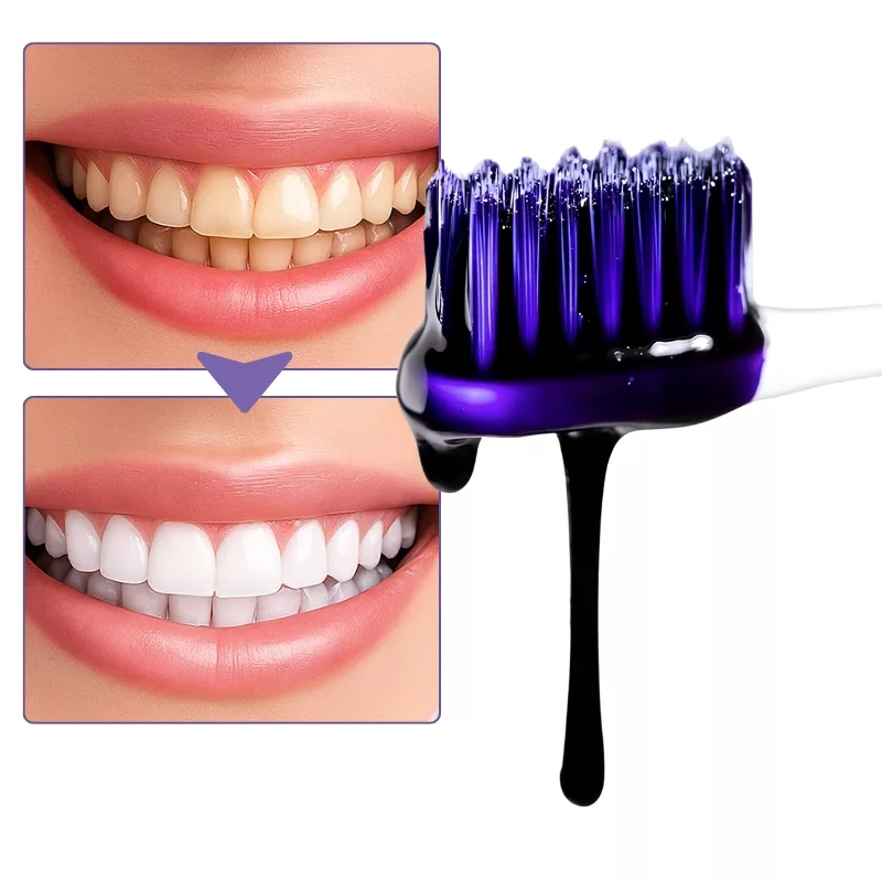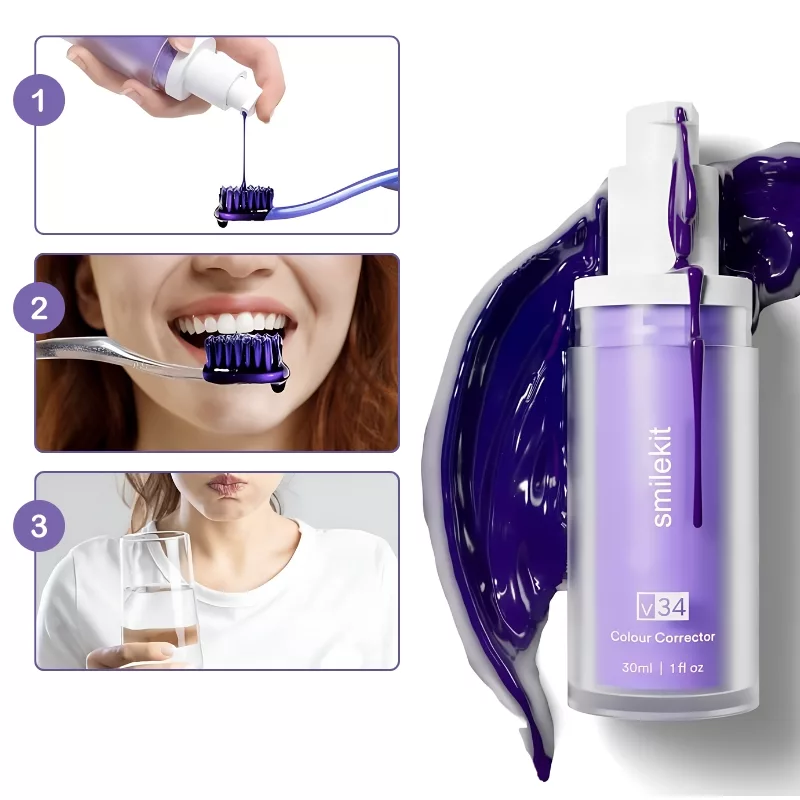 Uppnå ett märkbart vitare leende efter bara några användningar av vår lila tandkräm. Den hjälper till att neutralisera gula toner utan några starka kemikalier. Den är säker för emaljen, vilket gör den lämplig för daglig användning.