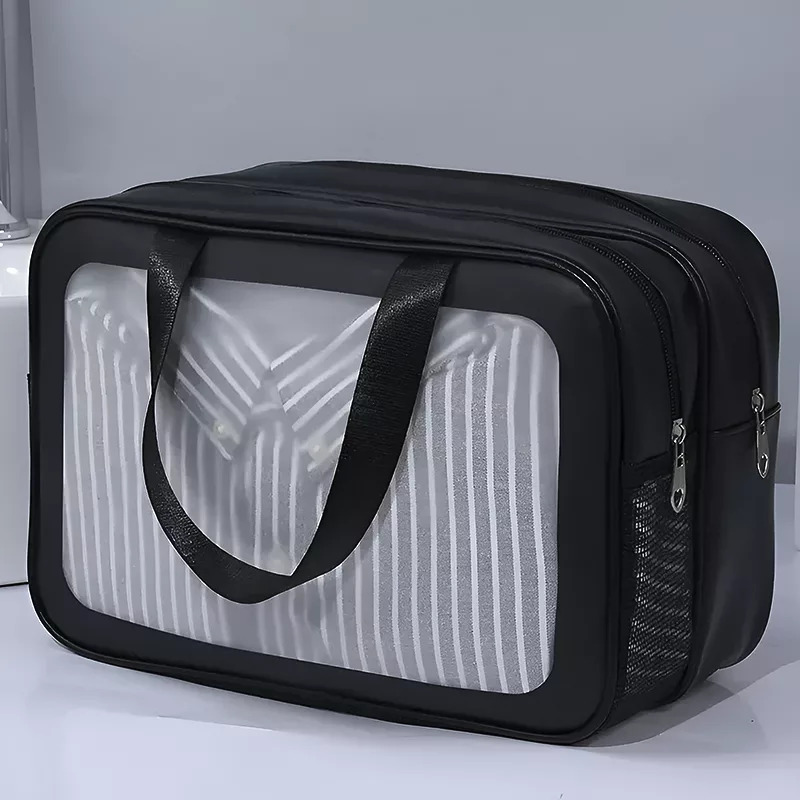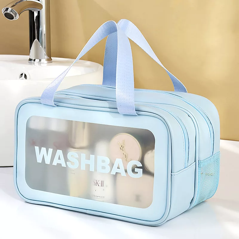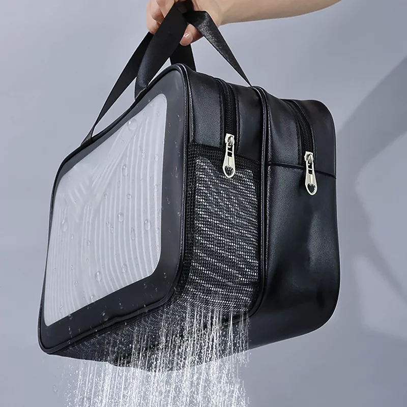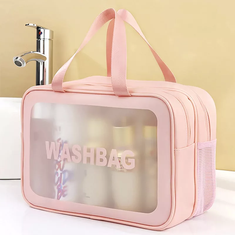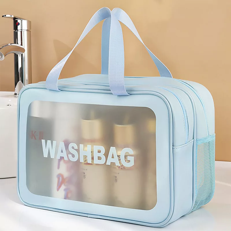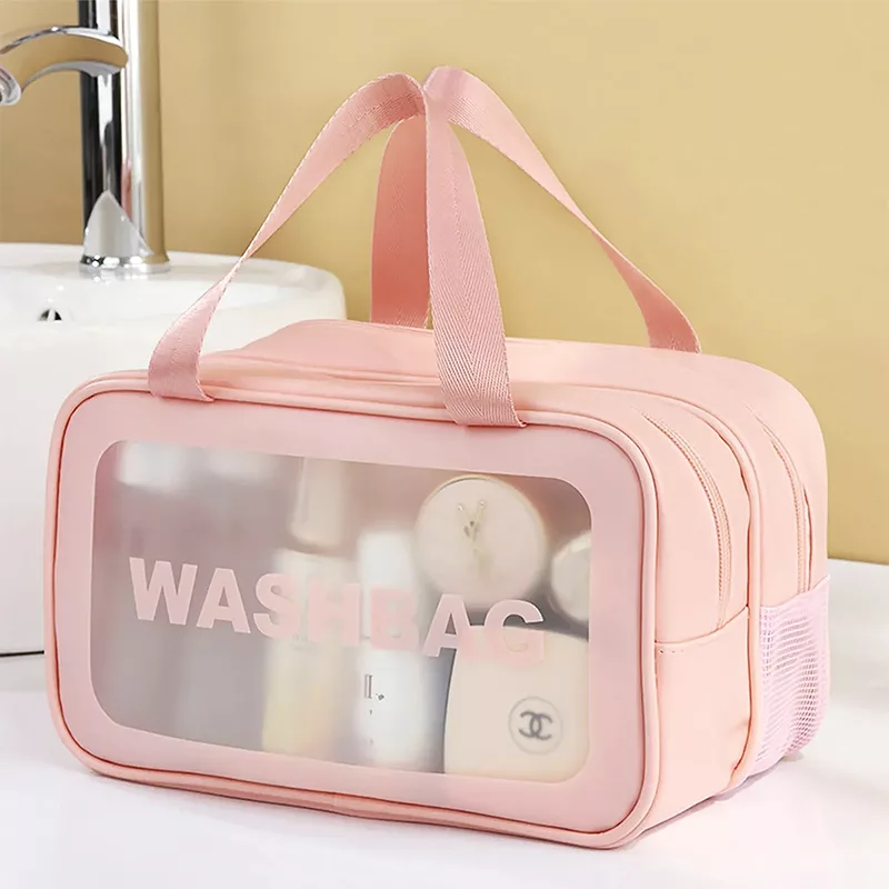 Genomskinlig resenecessär för kosmetika och sminkförvaring med dragkedja